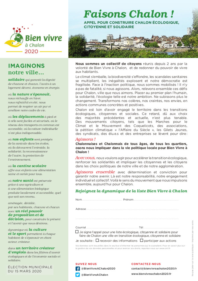 Nous sommes un collectif de citoyens réunis depuis 2 ans par la volonté de Vien Vivre à Chalon, et de redonner du pouvoir de vivre aux Habitants…/…